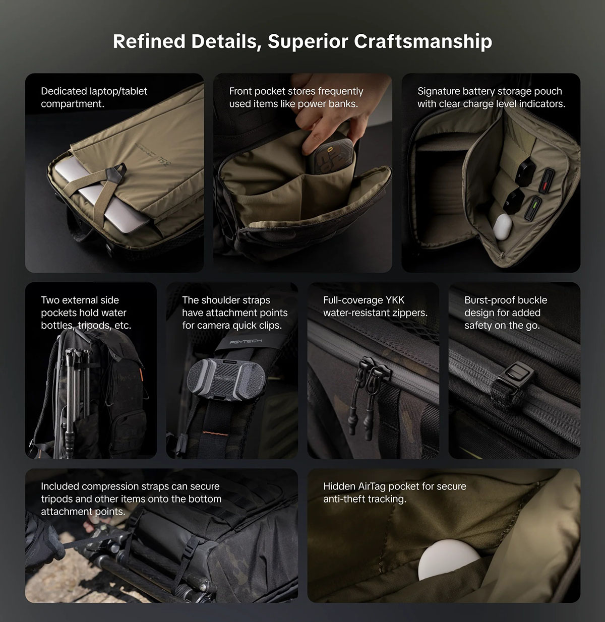 PGYTECH OneMo Tactical là dòng Balo máy ảnh chuyên nghiệp, kết hợp giữa công năng nhiếp ảnh và phong cách Tactical bụi bặm. Với hai phiên bản 25L và 35L, chiếc balo này được sinh ra để chinh phục những điều kiện khắc nghiệt nhất. Cùng hai màu sắc: Dark Night Camo, Coyote Brown sẽ mang đến nguồn cảm hứng sáng tạo cho các nhiếp ảnh gia đam mê di chuyển.