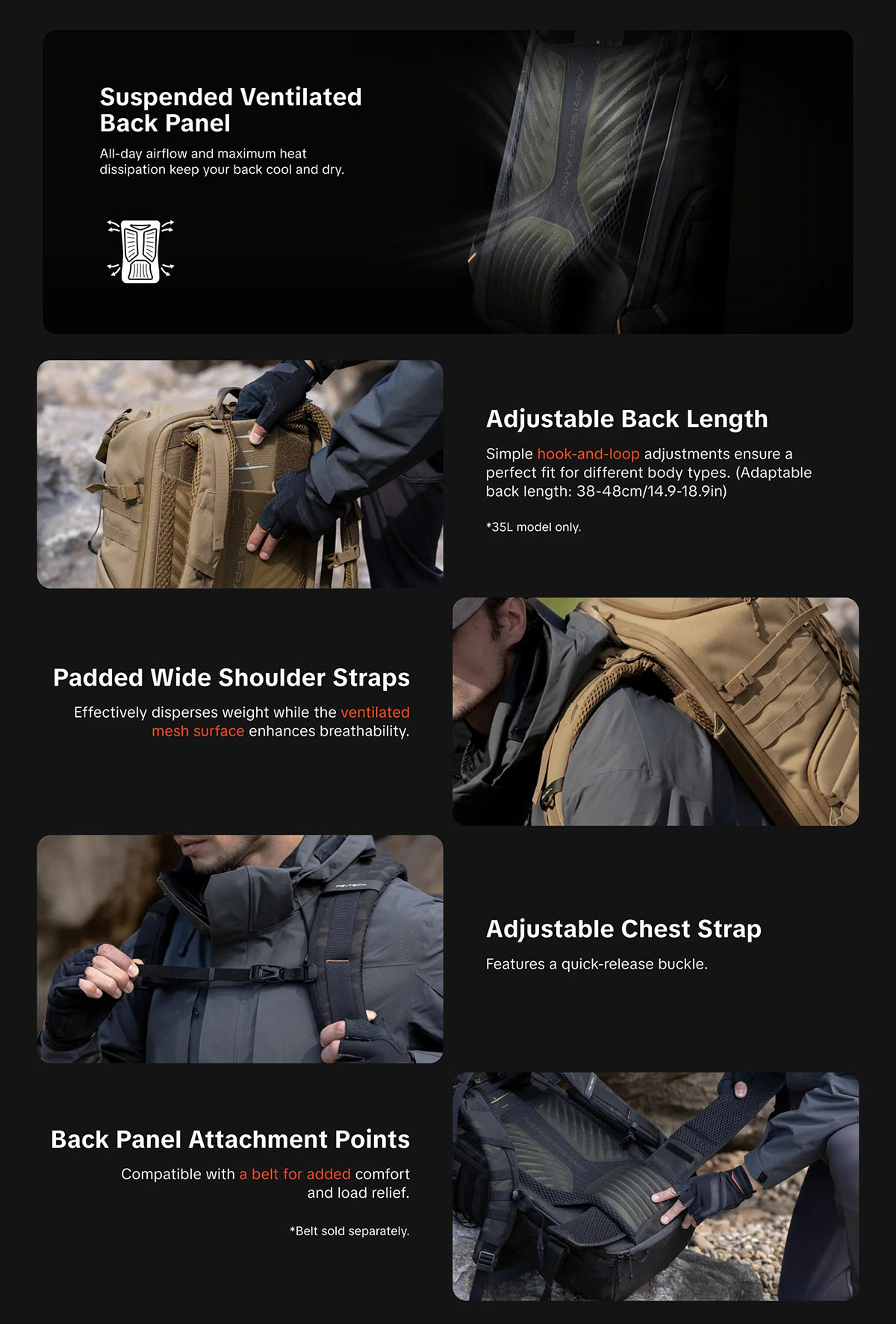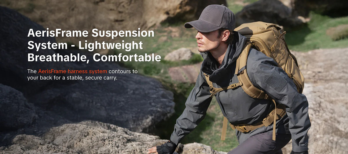Hệ thống trợ lực AerisFrame: Thiết kế ôm sát cột sống, thoáng khí, kết hợp quai đeo dày giúp giảm tải áp lực lên vai (hỗ trợ gắn thêm đai hông).