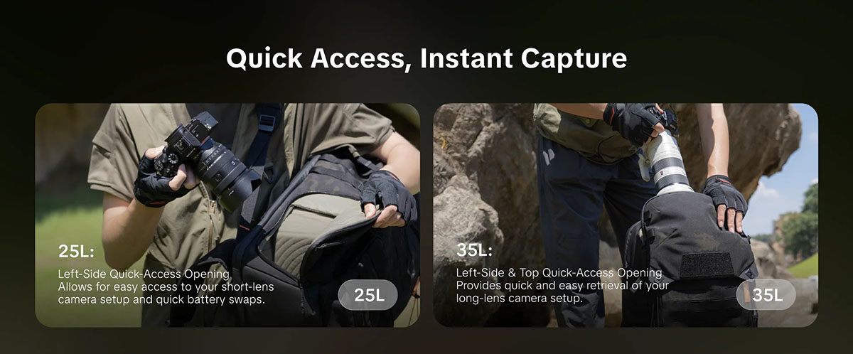 Truy cập nhanh bên hông: Thiết kế cửa hông tiện lợi giúp lấy máy ảnh tức thì, bắt trọn mọi khoảnh khắc.