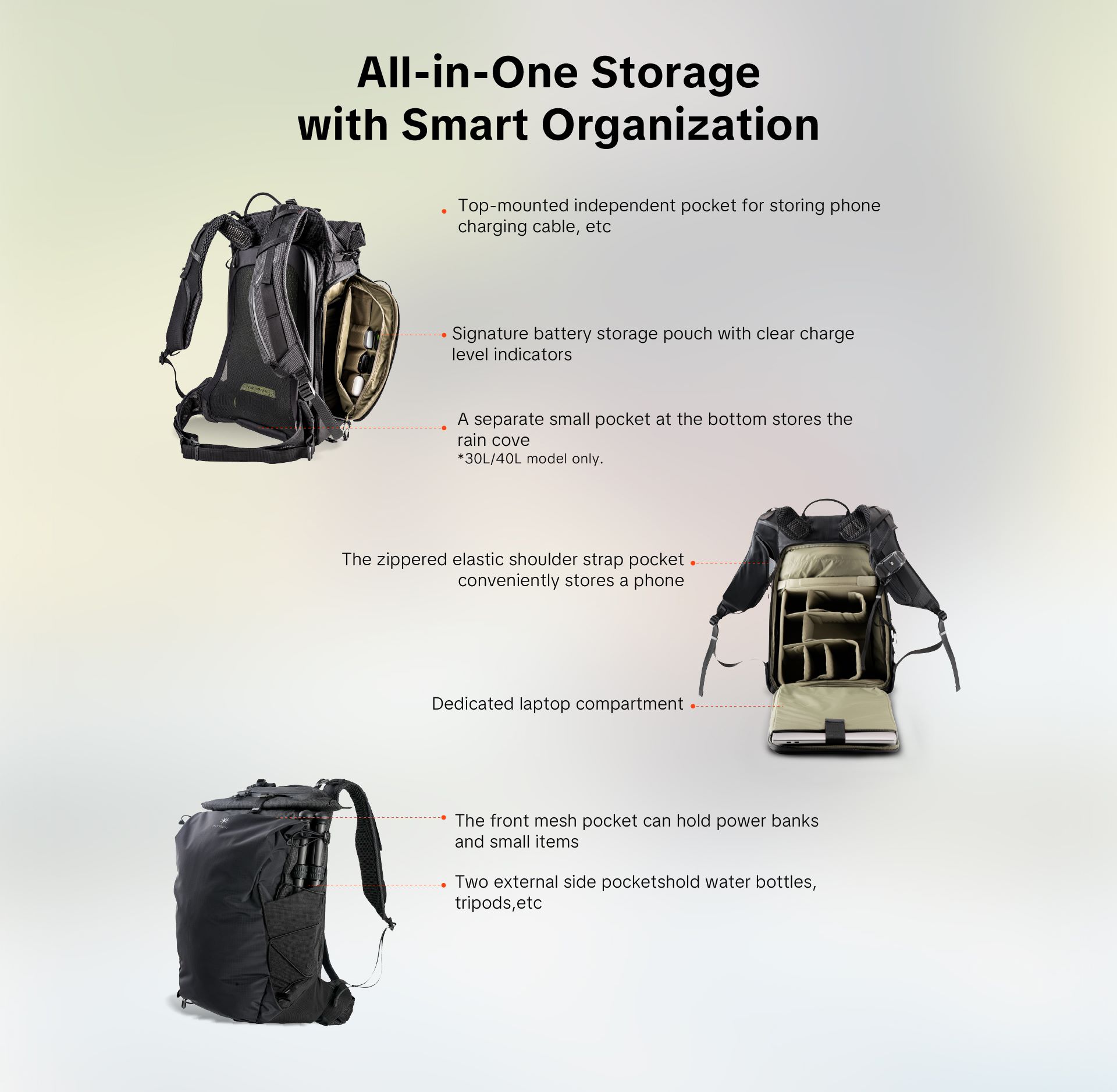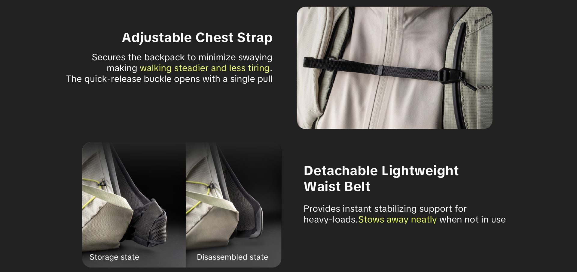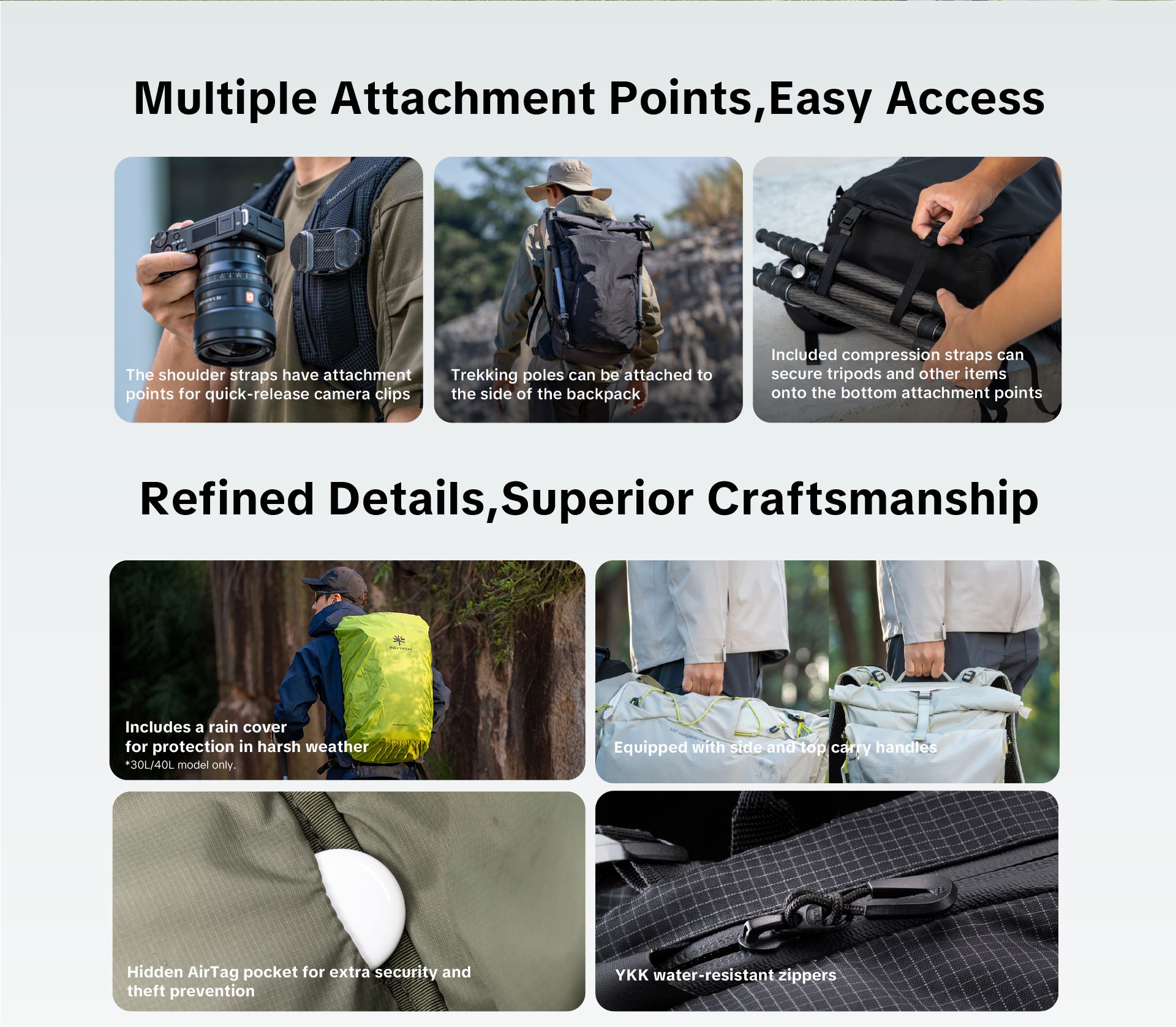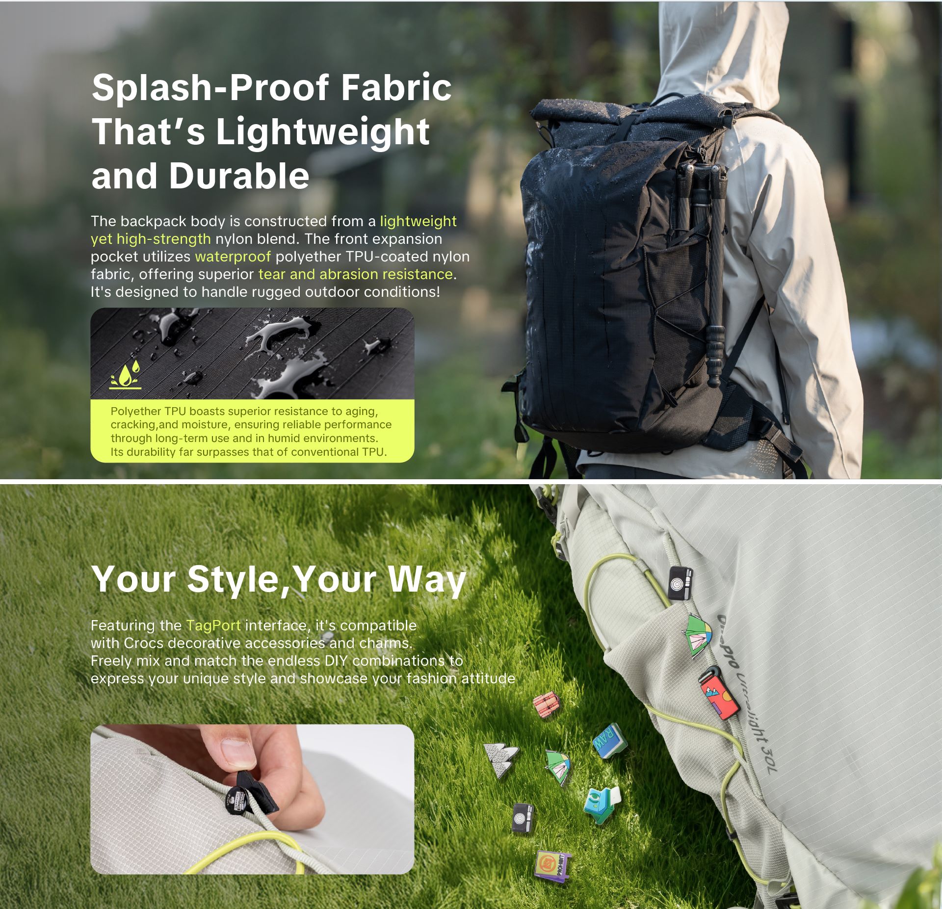 Không chỉ đeo thoải mái, OnePro Ultralight còn sở hữu khả năng lưu trữ thông minh "All-in-One" với ngăn chính rộng rãi, ngăn laptop riêng biệt và khả năng mở rộng không gian linh hoạt ở mặt trước lẫn nắp cuộn bên trên. Balo được chế tác từ vật liệu Nylon pha siêu bền kết hợp lớp phủ Polyether TPU chống thấm nước, chống mài mòn và rách cực tốt, đi kèm với các tiện ích tinh tế như ngăn chứa AirTag ẩn, khóa YKK kháng nước và vị trí gắn phụ kiện trang trí TagPort độc đáo.