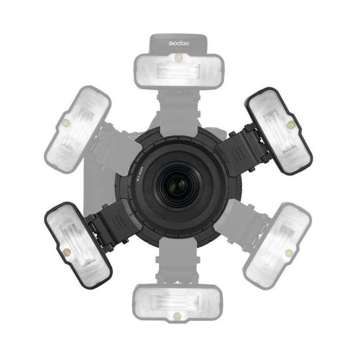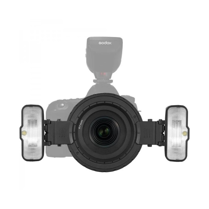 Ngoài ra bộ sản phẩm có kèm bộ điều hợp định vị siêu cận cảnh với cấu trúc dốc được thiết kế đặc biệt, cho phép bạn nghiêng đầu đèn flash vào trong về phía ống kính để chụp ảnh siêu cận cảnh. Để bật/tắt máy ảnh, đầu đèn flash cần có bộ phát được mua riêng và tương thích với Godox XPro, X1, X2 cũng như các bộ kích hoạt đèn flash không dây tùy chọn khác dành cho máy ảnh của các thương hiệu lớn như Nikon, Sony, Canon, Fujifilm, Olympus và Panasonic.