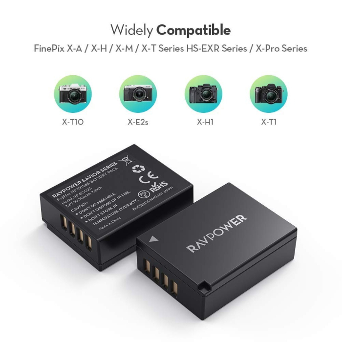 Bộ 2 pin và sạc kép RAVPower RP-BC023 là lựa chọn dự phòng hoàn hảo cho bạn với một sạc kép cho phép sạc hai pin cùng lúc và hai pin thay thế 1000mAh mỗi pin giúp tăng gấp đôi thời gian sử dụng, để bạn có thể thoải mái chụp hình mà không ngại giới hạn thời lượng. Sạc kép tương thích với pin Fujifilm NP-W126S, trong khi đó, pin thay thế đáp ứng mọi thông số kỹ thuật với pin NP-W126S để tương thích các dòng máy ảnh Fujifilm FinePix, X-A5, X-H1, X-A10, X100F, X-T10, X-T20, X-Pro1, X-Pro2, 30EXR, HS33EXR, HS35EXR, HS50EXR, X-A1, X-A2, X-A3, X-E1, X-E2, X-E2S, X-M1, X-T1, X-T2,...