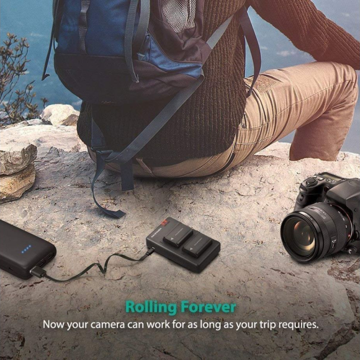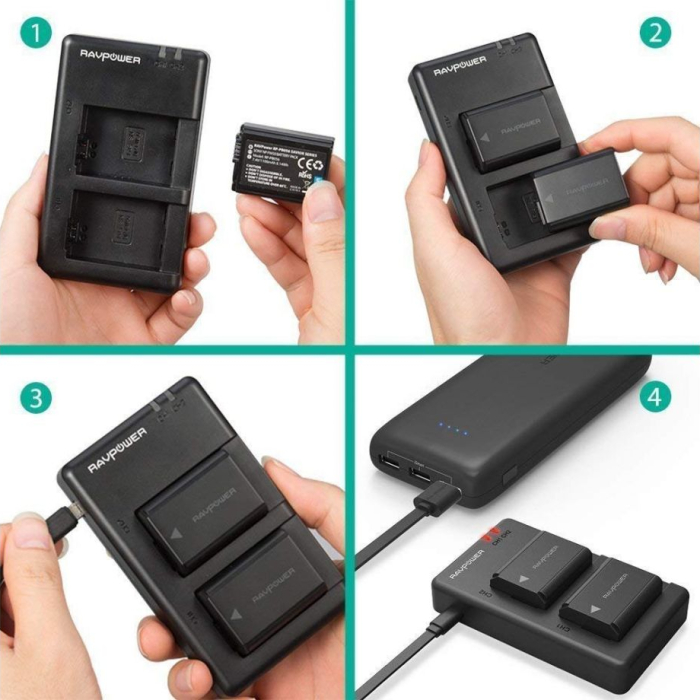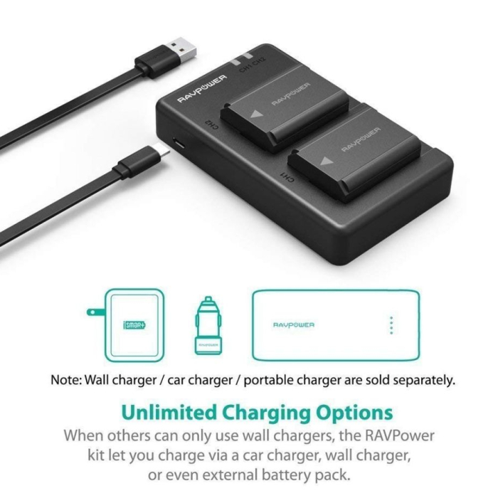 Bộ 2 pin và sạc kép RAVPower RP-PB056 là lựa chọn dự phòng hoàn hảo cho bạn với một sạc kép cho phép sạc hai pin cùng lúc và hai pin thay thế 1100mAh mỗi pin giúp tăng thời gian sử dụng, để bạn có thể thoải mái chụp hình mà không ngại giới hạn thời lượng. Sạc kép tương thích với pin Sony NP-FW50, trong khi đó, pin thay thế đáp ứng mọi thông số kỹ thuật với pin NP-FW50 để tương thích các dòng máy ảnh Sony NEX 3/5/7 (NEX-3, NEX-3N, NEX-5, NEX-5C, NEX-5N, NEX-5R, NEX-5T, NEX-6, NEX-7, NEX-C3, NEX-F3), SLT-A (SLT-A33, SLT-A35, SLT-A37, SLT-A55V), DSC-RX10, Alpha (A7, A7 II, A7R, A7R II, A7S, A7S II, A3000, A5000, A5100, A6000, A6300, A6500,...).