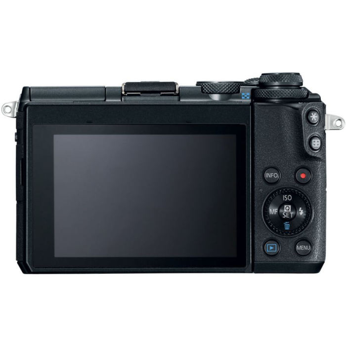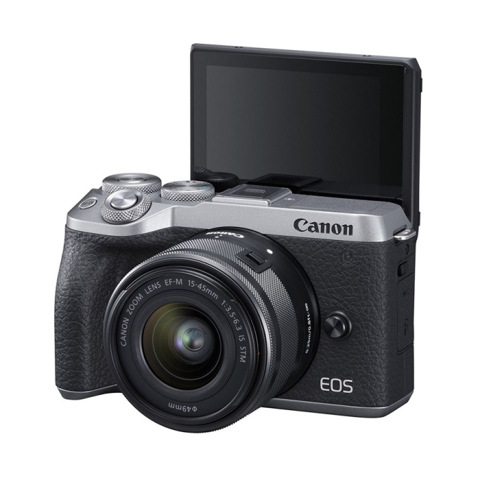 Ngoài những tính năng về chất lượng hình ảnh, Canon EOS M6 + Kit 15-45mm IS STM có thiết kế ngoại hình gọn nhỏ nhưng không kém phần mạnh mẽ. M6 sở hữu màn hình cảm ứng LCD 3 inch độ phân giải 1,040,000 điểm ảnh và lật lên 180 độ, rất hữu ích cho bạn chụp ảnh tự sướng. Tuy nhiên, EOS M6 không tích hợp EVF mà bạn có thể mua EVF rời gắn vào.