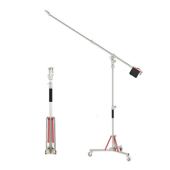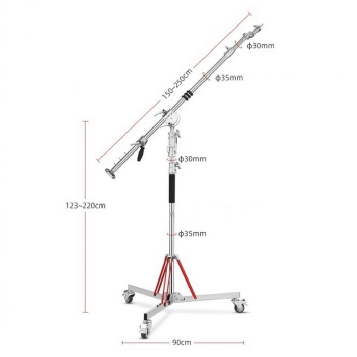 Chân đèn đi kèm với tay boom gồm 2 đoạn đường kính ống 35/30mm với sải dài 150cm đến 250cm.