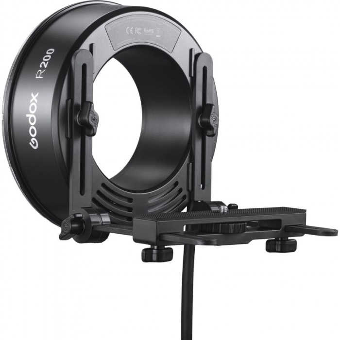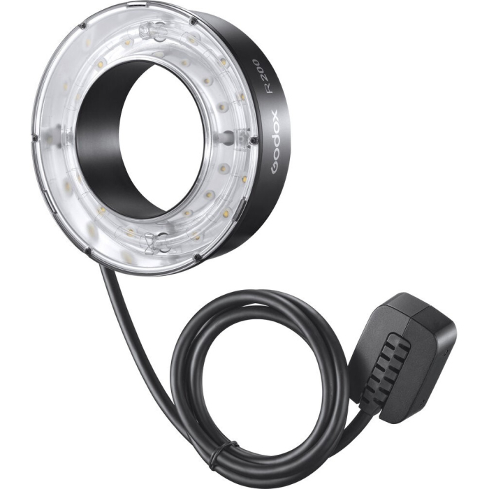 Đầu đèn flash vòng Godox R200 công suất 200W, đường kính 18.8cm dùng cho đèn flash bỏ túi AD200 và AD200Pro là một sự mở rộng khác về khả năng của những đèn flash nhỏ gọn này, mang lại chất lượng ánh sáng dịu, giống như quầng sáng và thu hút ánh sáng phản chiếu vào mắt đối tượng của bạn. Đèn vòng có đèn dẫn 10W với cài đặt công suất tùy chỉnh ba cấp độ, cho cường độ chiếu sáng 1300 lux ở 0.5m.