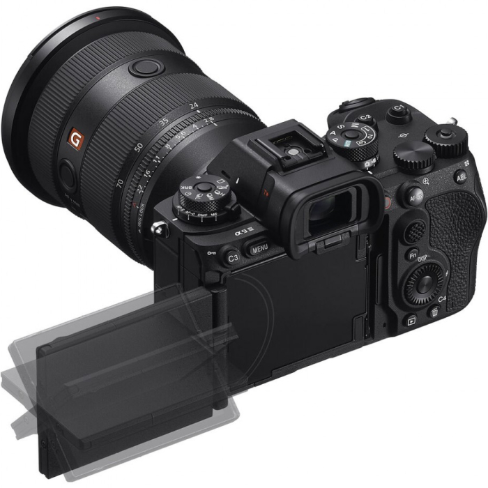 Màn hình LCD cảm ứng đa góc 4 trục 3.2 inch 2.1 triệu điểm lần đầu tiên xuất hiện trên a7R V. Màn hình này có gam màu rộng bao phủ không gian DCI-P3.