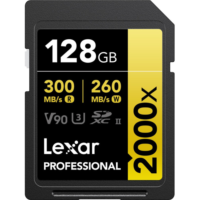 Thẻ nhớ SDXC Lexar 128GB 300MB/s Professional 2000x UHS-II Gold Series thuộc dòng thẻ nhớ SDXC 2000x UHS-II Gold Series chuyên nghiệp, hỗ trợ các chức năng nâng cao cho máy ảnh kỹ thuật số như chụp liên tục và chụp nhanh, cũng như chụp ảnh RAW và JPEG. Thẻ nhớ này cũng rất phù hợp để quay video, bao gồm video 4K, 3D và Full HD, đồng thời có thể đạt tốc độ đọc tối đa lên đến 300MB/s và tốc độ ghi tối đa lên đến 260MB/s. Nhờ xếp hạng loại tốc độ V90, tốc độ ghi tối thiểu được đảm bảo không giảm xuống dưới 90MB/s.