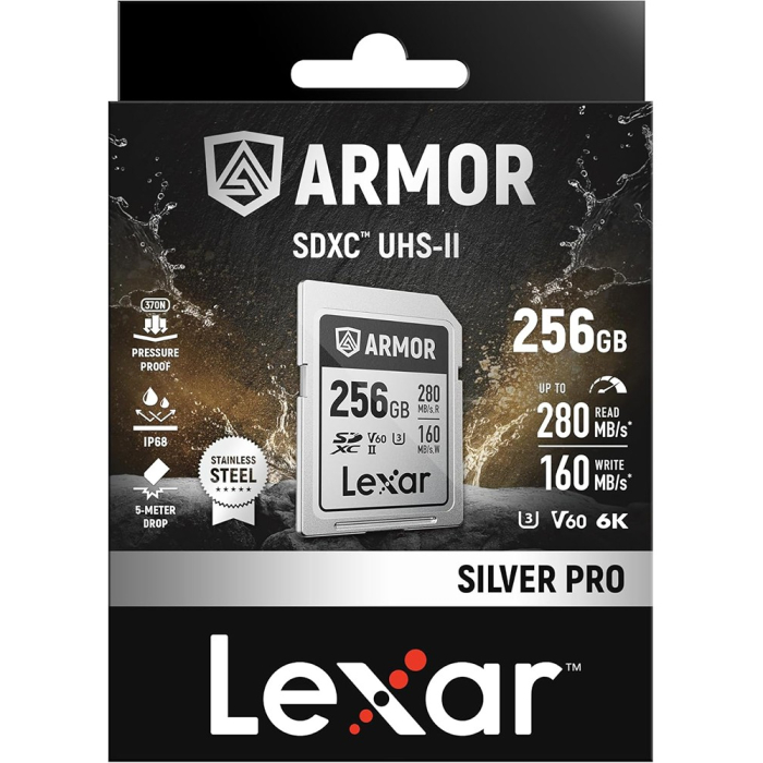 Thẻ nhớ SDXC Lexar 256GB 280MB/s thuộc dòng thẻ nhớ Armor Silver Pro Series SDXC UHS-II - dòng thẻ nhớ đầu tiên trên thế giới sử dụng vật liệu thép không gỉ để bảo vệ dữ liệu của bạn. Được chế tạo bằng thép không gỉ siêu bền và được xếp hạng IP68, thẻ Lexar Armor Silver Pro Series SDXC UHS-II được thiết kế để chịu được những cú va chạm khi bạn khám phá thiên nhiên hoang dã. Từ việc chịu đựng những điều kiện khắc nghiệt và chịu được những cú rơi cho đến việc chống chọi với thời tiết, thẻ nhớ này đã sẵn sàng cho cuộc phiêu lưu. Được xếp vào chuẩn tốc độ video 60 (V60), thẻ này quay phim liền mạch ở độ phân giải 6K mà không bỏ lỡ khung hình nào.