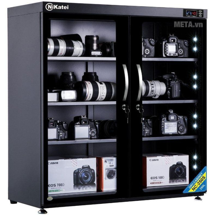 - Tủ chống ẩm cao cấp Nikatei NC-250S có không gian rộng lớn giúp bạn có thể thoải mái cất giữ máy ảnh, phim chụp tiện dụng. Tủ chống ẩm được thiết kế dáng cao với 2 cánh có khóa riêng biệt với thiết kế 2 lớp kính nhằm chống xước, chịu được sự va đập và đảm bảo tuyệt đối độ ẩm an toàn cho thiết bị.