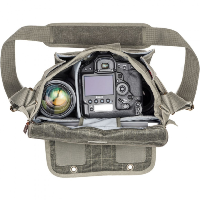Túi phù hợp đựng 1 thân máy ảnh DSLR hoặc MRL tiêu chuẩn kèm báng pin, tablet 10", laptop 12", 1 ống kính gắn sẵn (ví dụ 24-70mm f/2.8) và 1 ống kính phụ (ví dụ 70-200mm f/2.8), đèn flash, phụ kiện nhỏ.